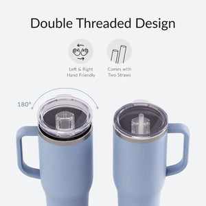 Tumblers are a 40 oz and made from food grade stainless steel with a double walled vacuum insulated construction to keep beverages cold or hot for hours. Tumblers have a powder coated finish that protects against chips and scratches. Cups are dishwasher safe! Comes equipped with a large ergonomic handle for easy carrying throughout the day. Twist on, slide lid prevents accidental spills and splashes. Fits in standard sized cup holders for easy traveling and comes with 2 straws.