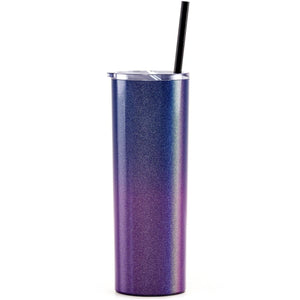 Tumblers are a 20 oz double wall stainless steel thermal bottle with a powder coated finish that protects against chips and scratches. Cups are dishwasher safe! Copper vacuum insulation keeps drinks cold 24 hr, hot 12 hr. Comes with a clear push-on lid and matching straw. Non-toxic and BPA-free.