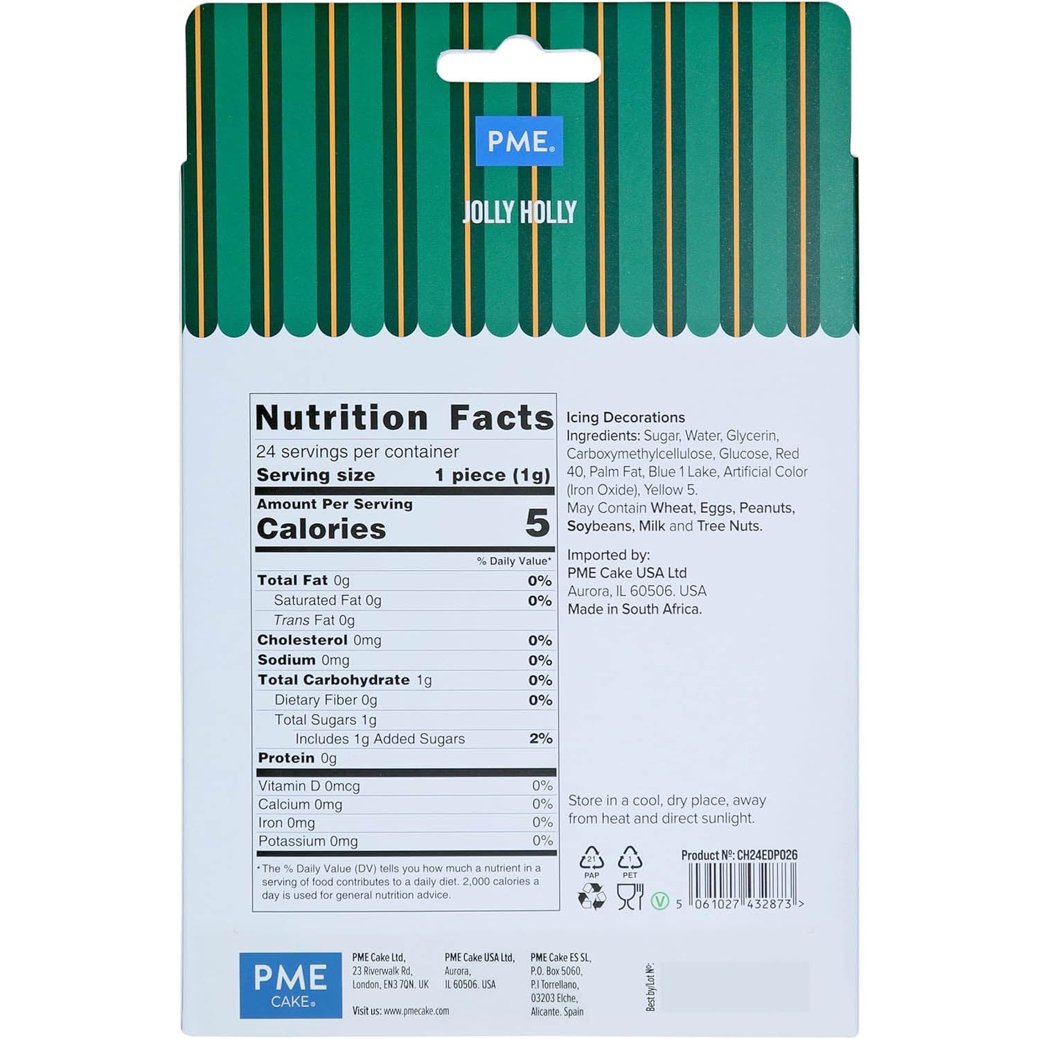 Made from edible gumpaste, this set of 24 toppers contains Holly shapes. Sweeten up the holidays and add some festive cheer to your Christmas treats with PME Sugar Decorations! Pre-cut and ready to use, simply place onto your cookies, cupcakes, cakes, or desserts. Store away from heat & direct sunlight.